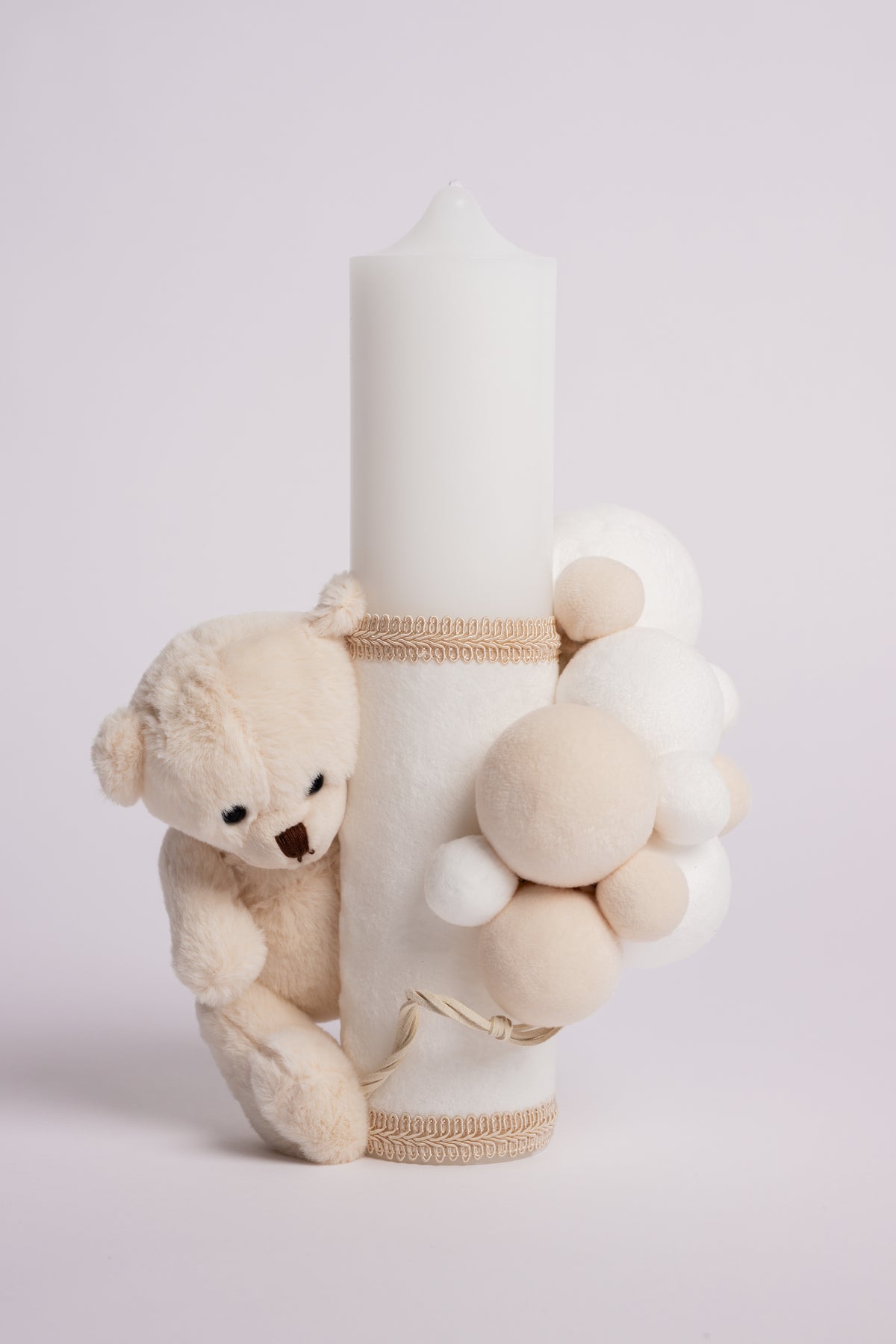 Lumanare de botez din catifea alba cu ursulet si bile - Embrace of Innocence