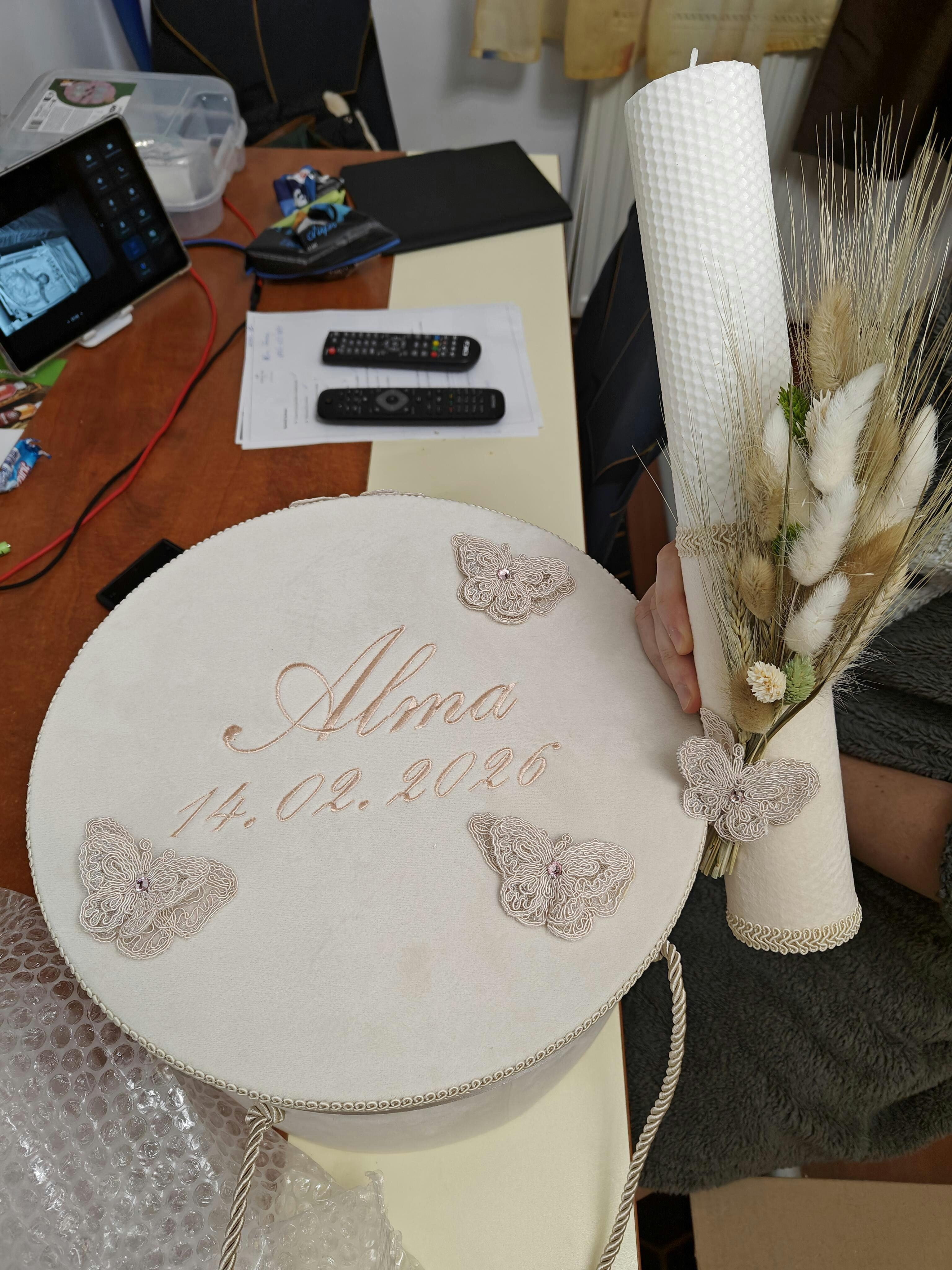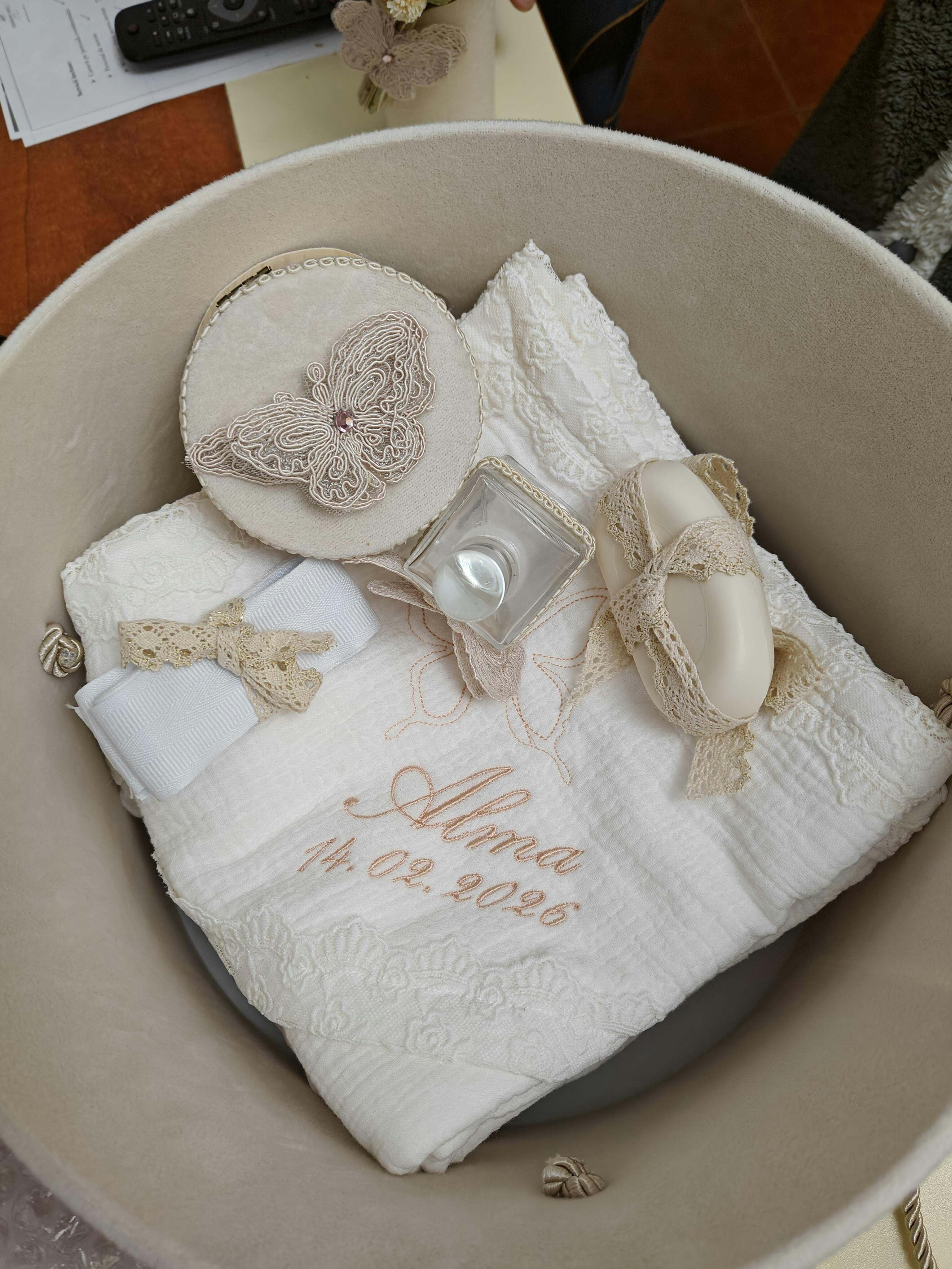 - Panza de mir din muselina,brodata cu fluturas, personalizata cu numele si data botezului, usoara si placuta la atingere, pregatita pentru momentul ceremonial.