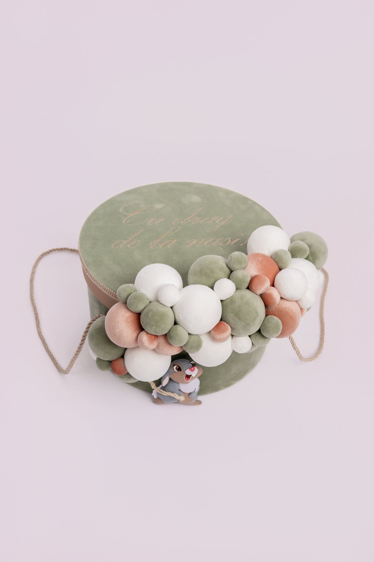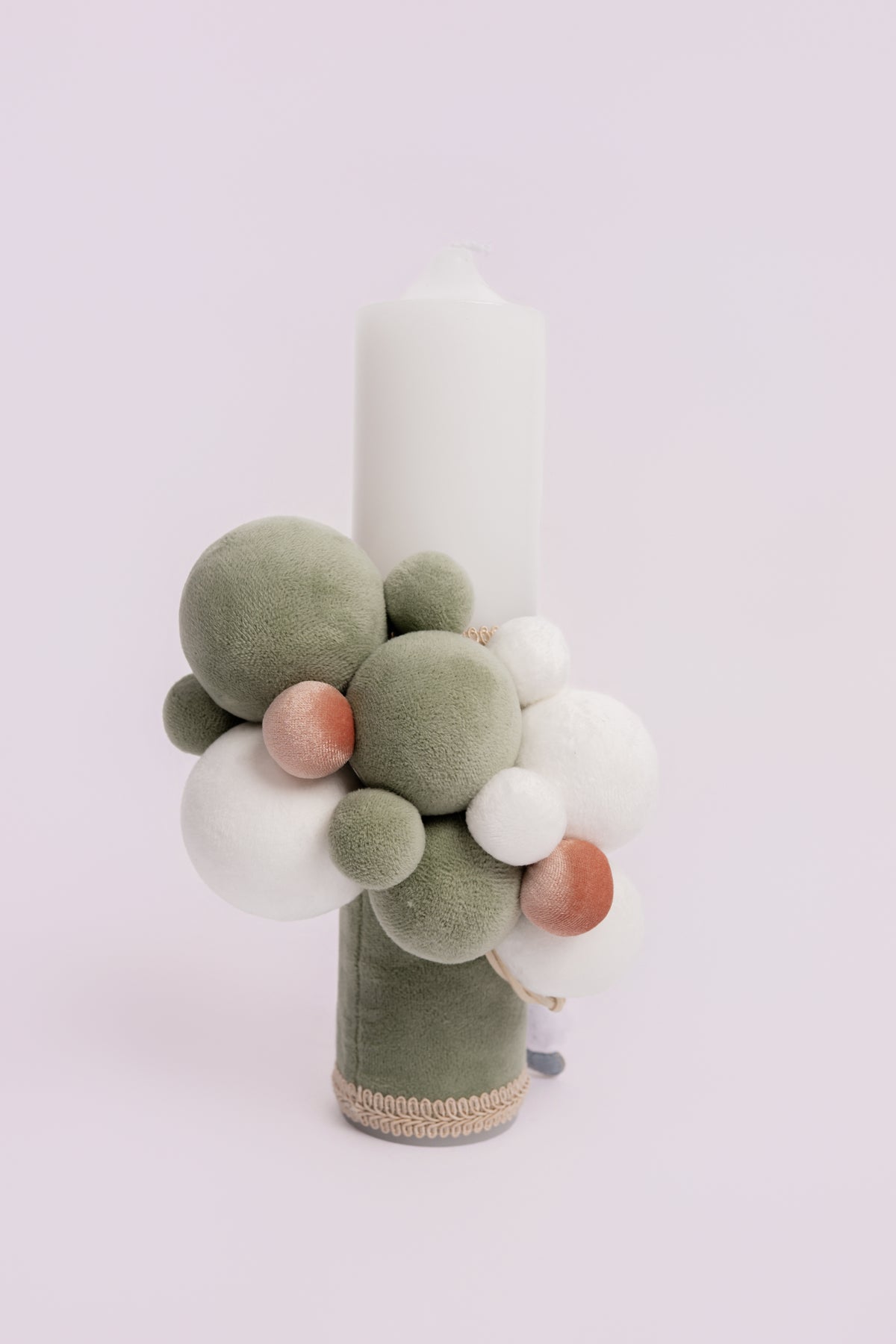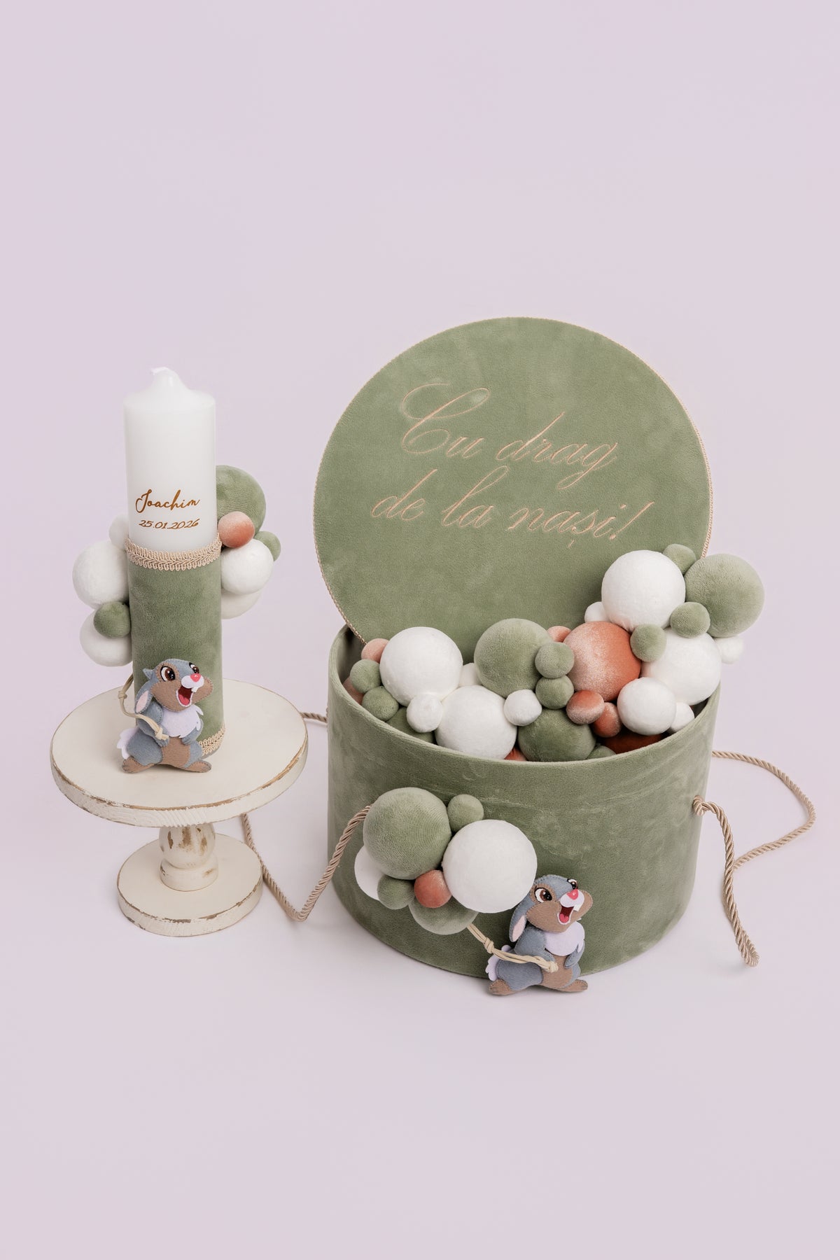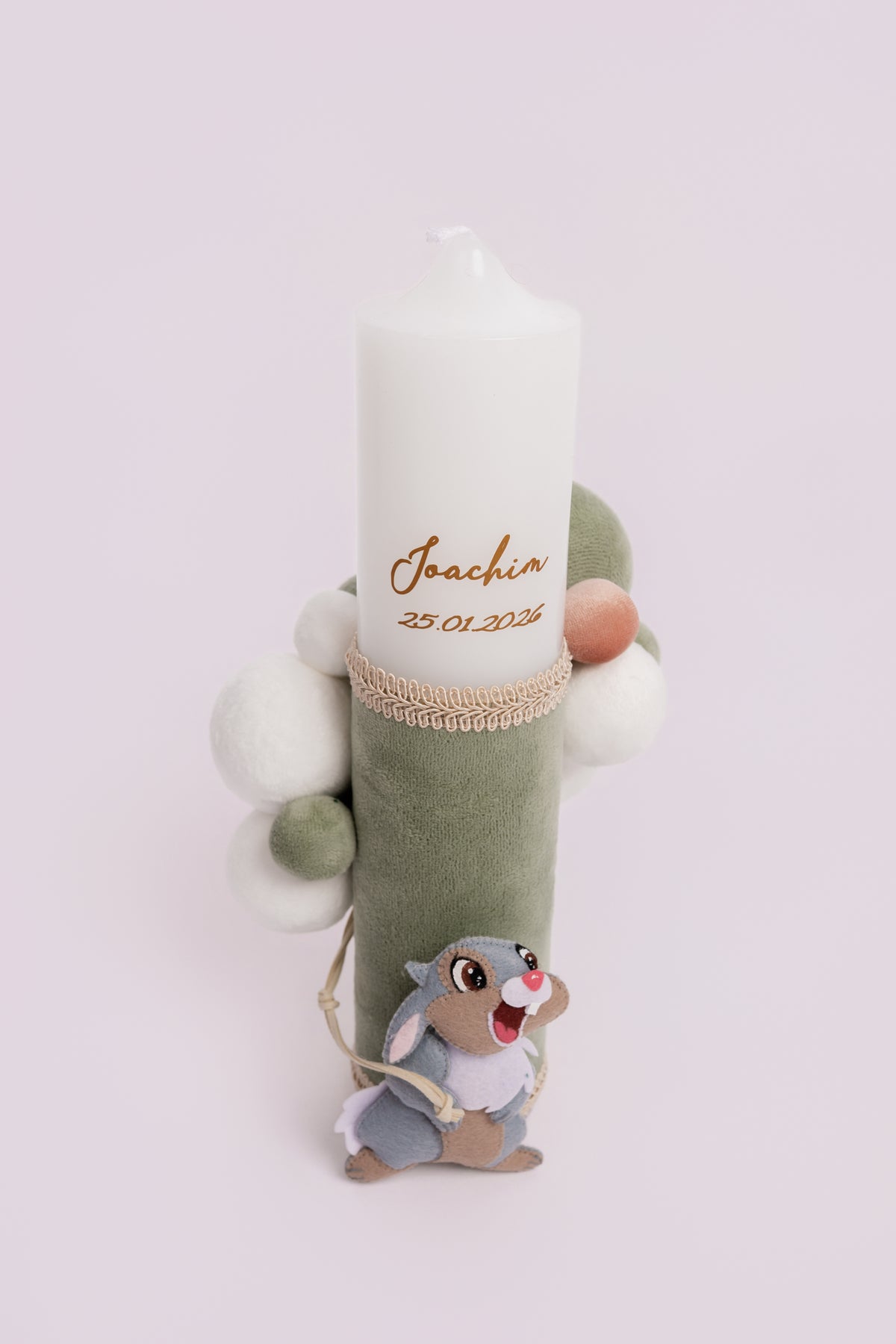 -*Lumanare*  decorata cu iepuras din fetru, baloane din catifea si personalizata cu numele copilului, se achizitioneaza separat!