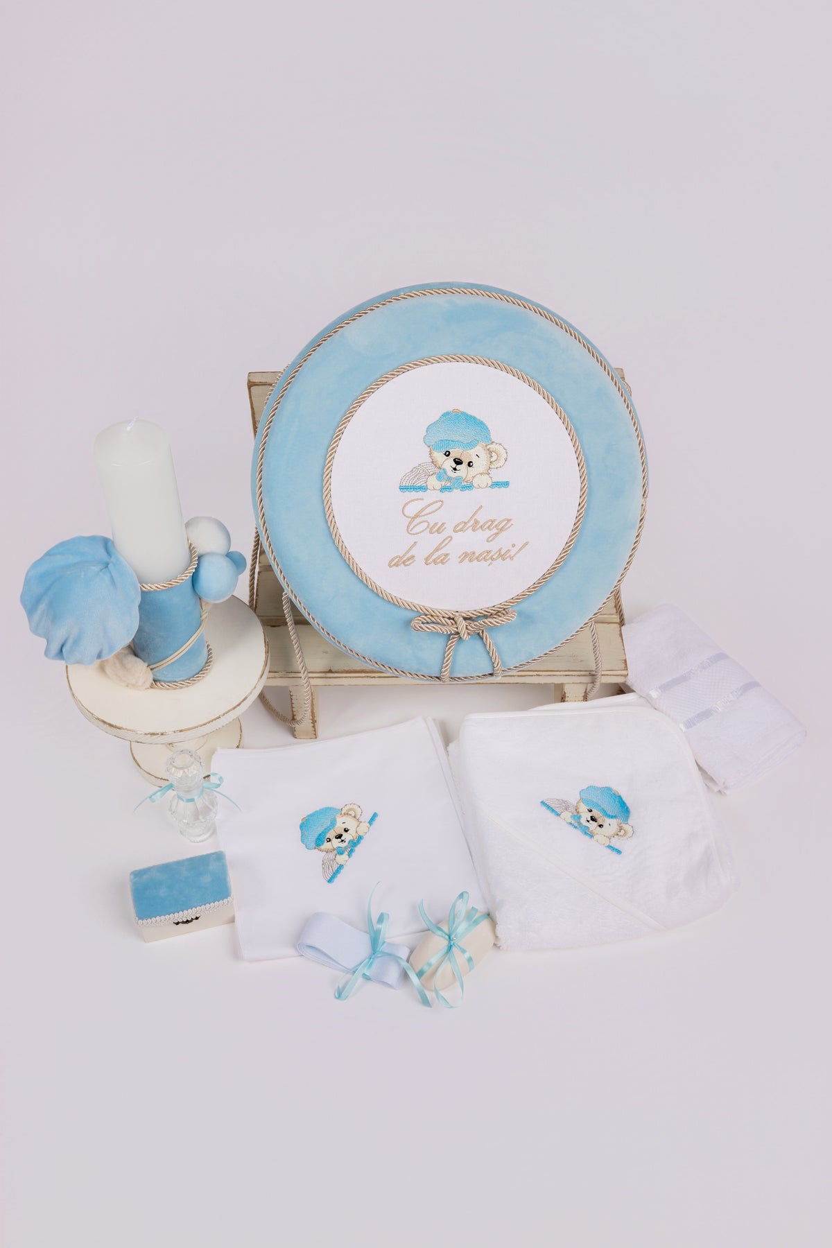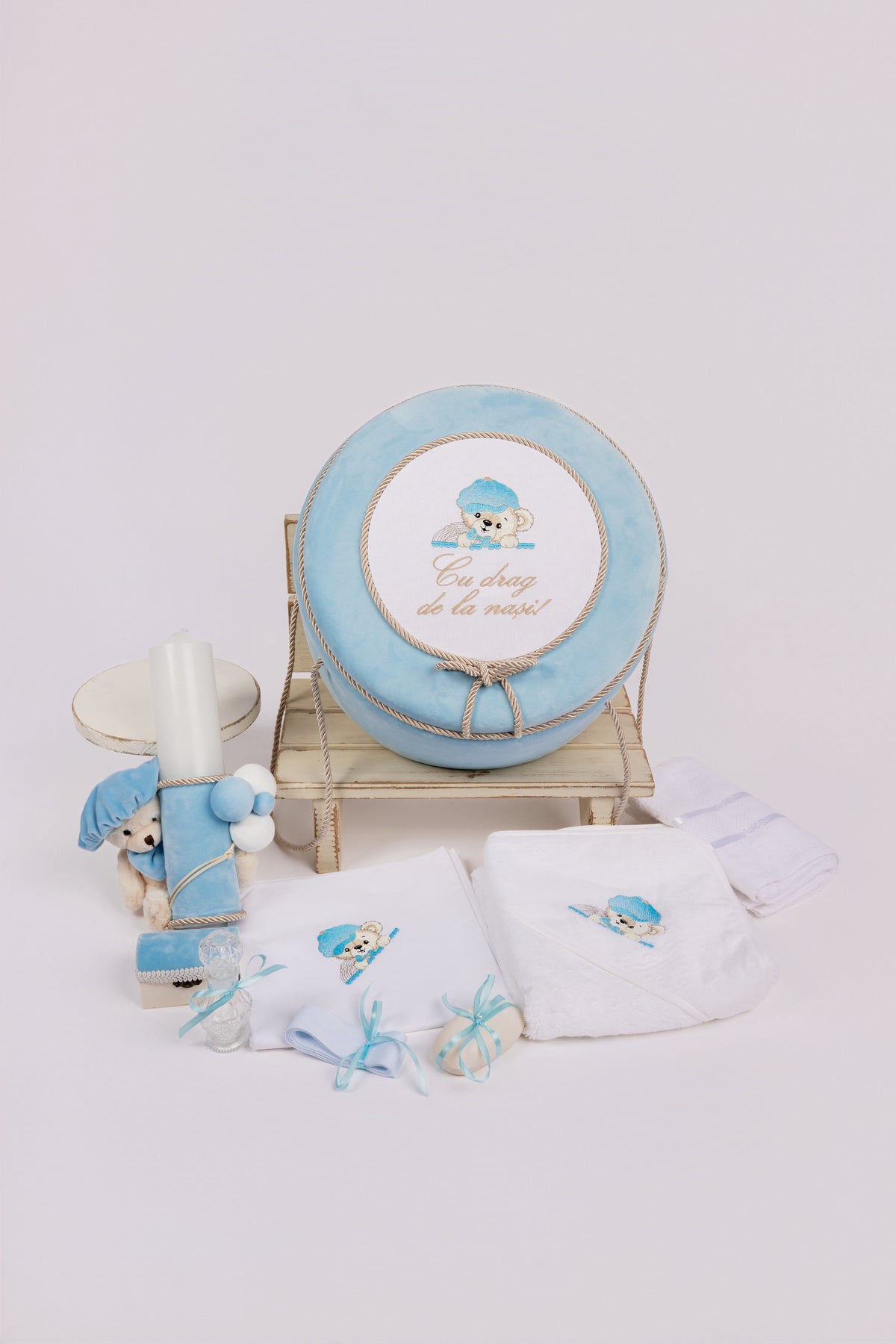 Setul contine toate elementele esentiale pentru un botez complet: