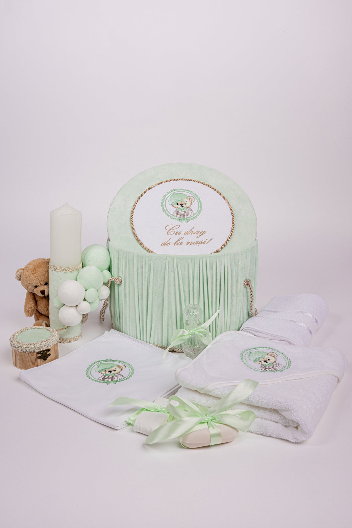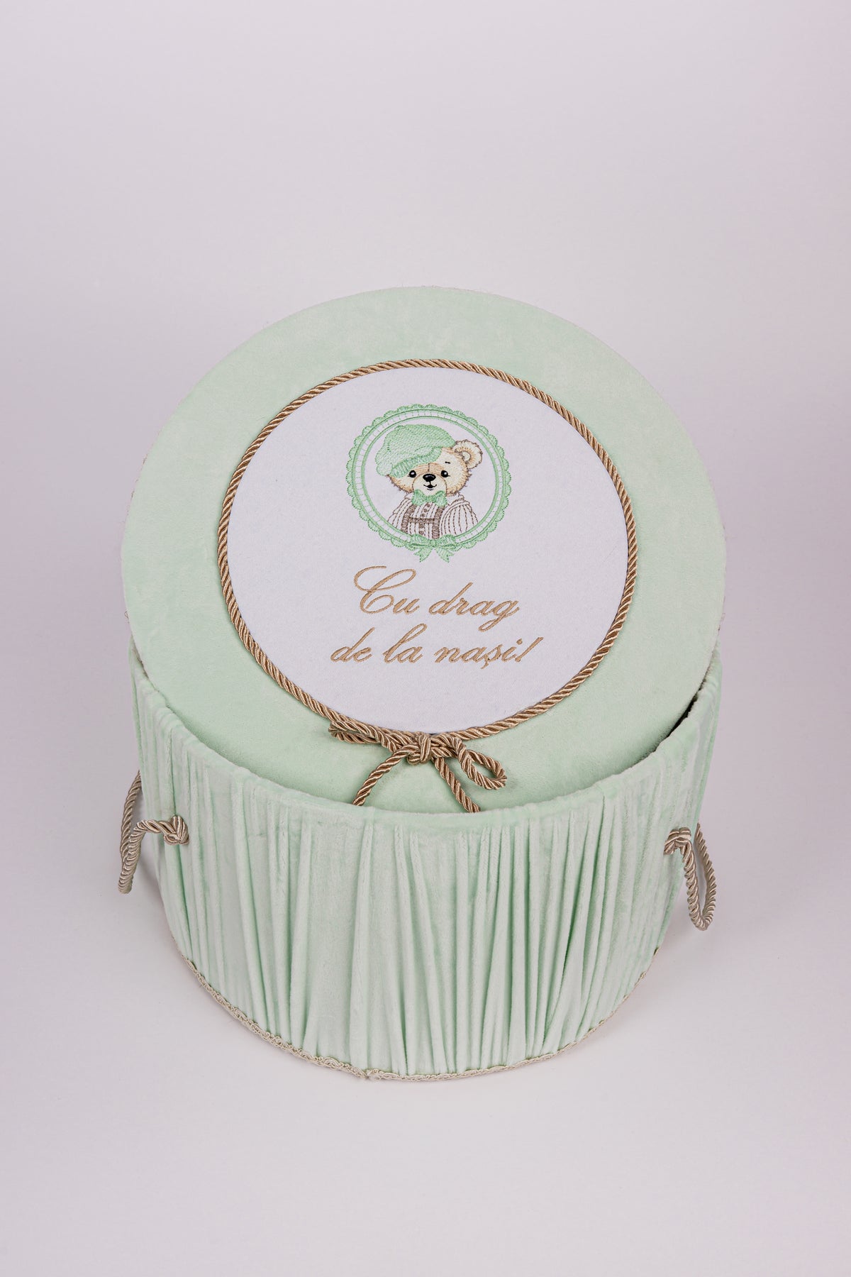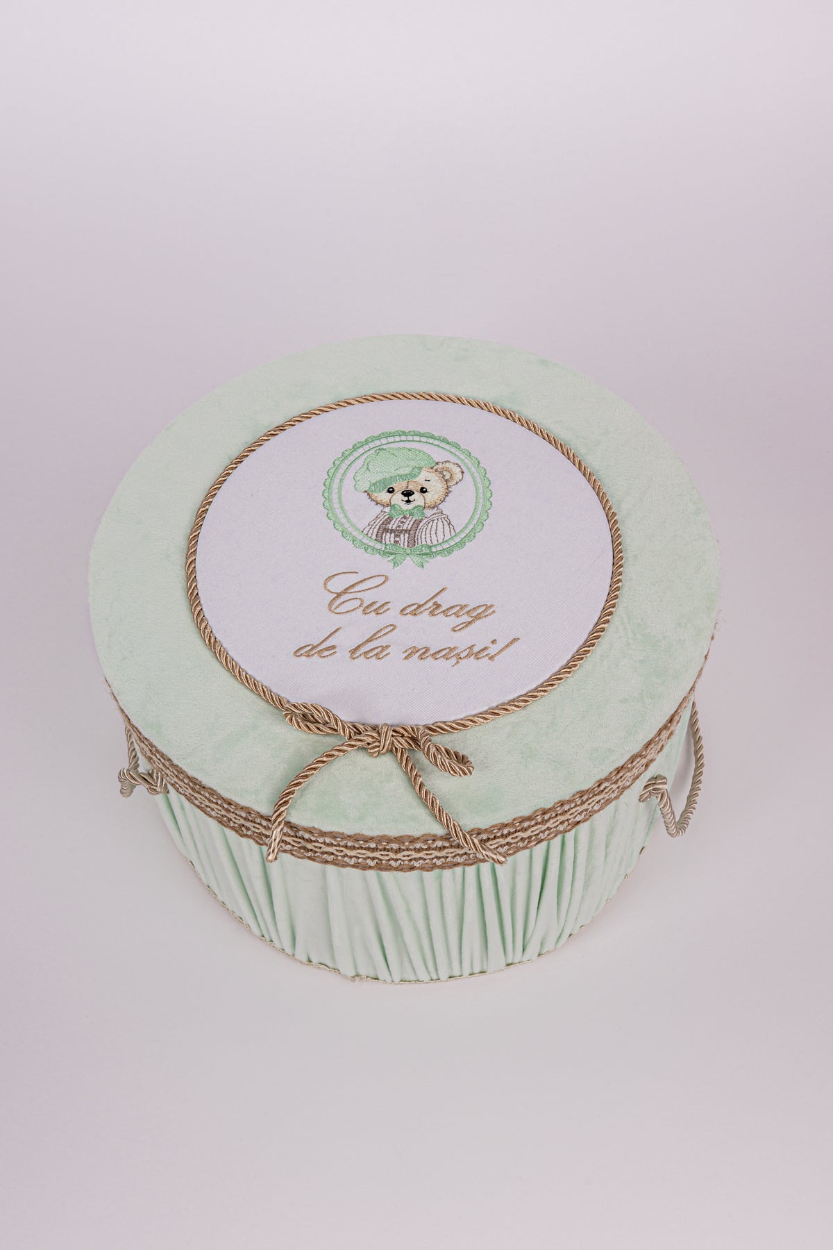 Trusou de botez personalizat verde pastel, cu un design rafinat si o cromatica delicata, ales pentru o ceremonie eleganta si echilibrata.