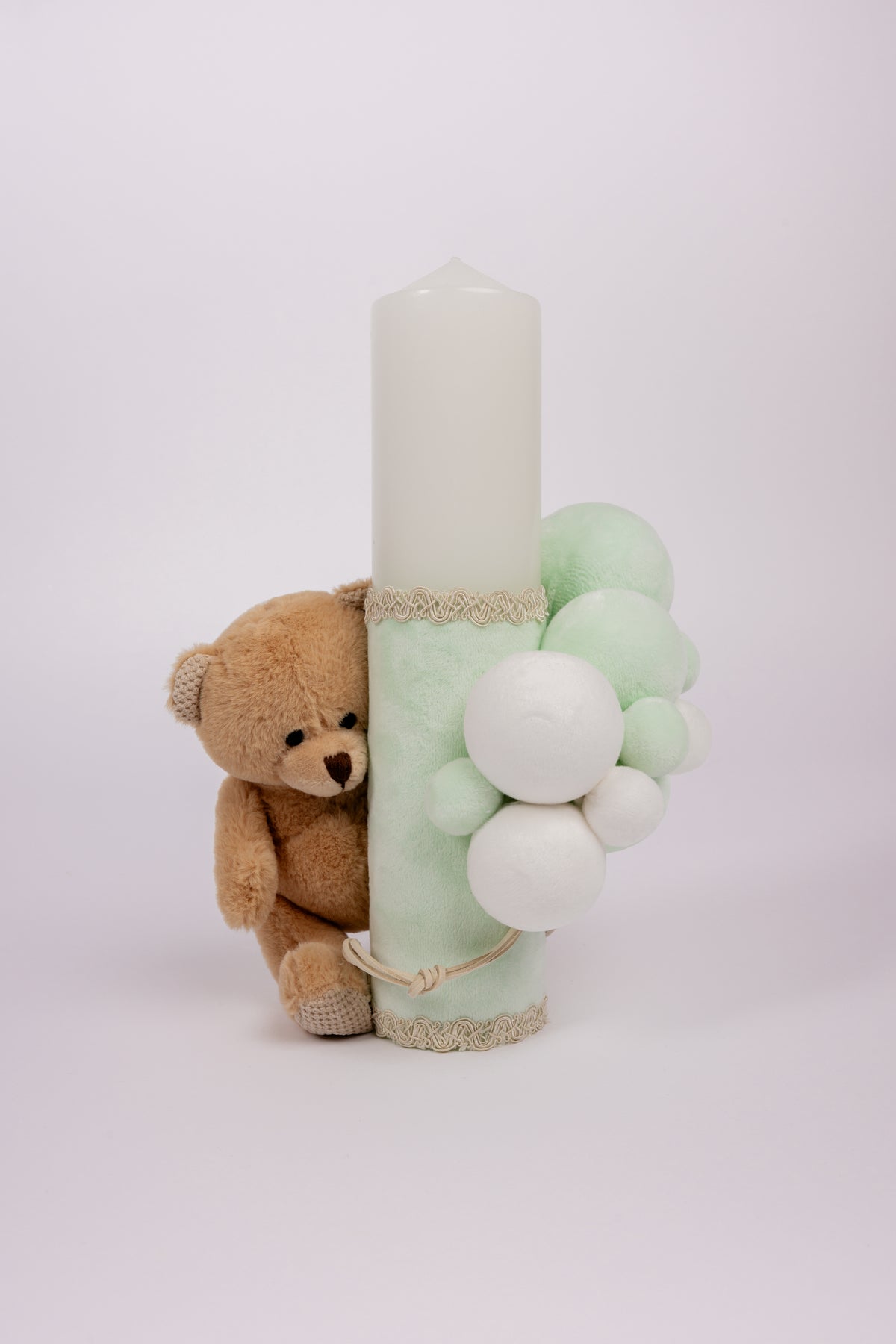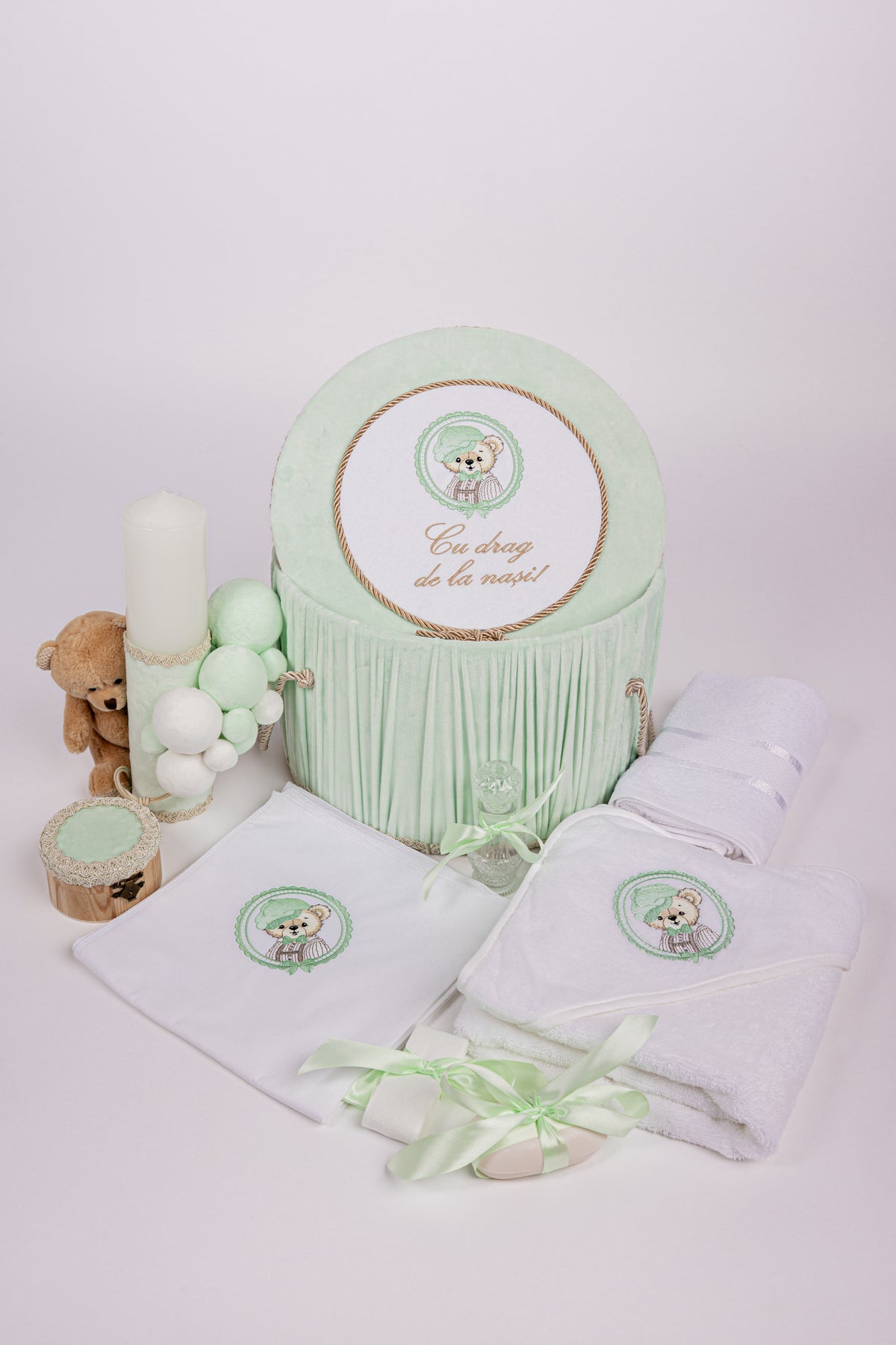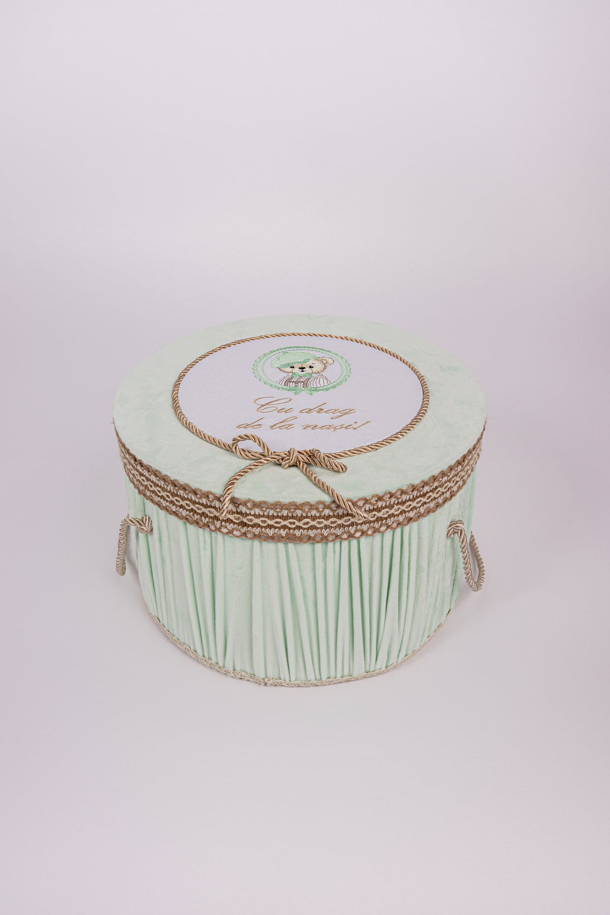 Trusou de botez personalizat verde pastel, cu un design rafinat si o cromatica delicata, ales pentru o ceremonie eleganta si echilibrata.