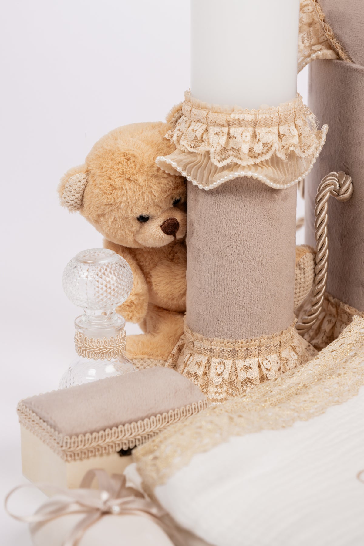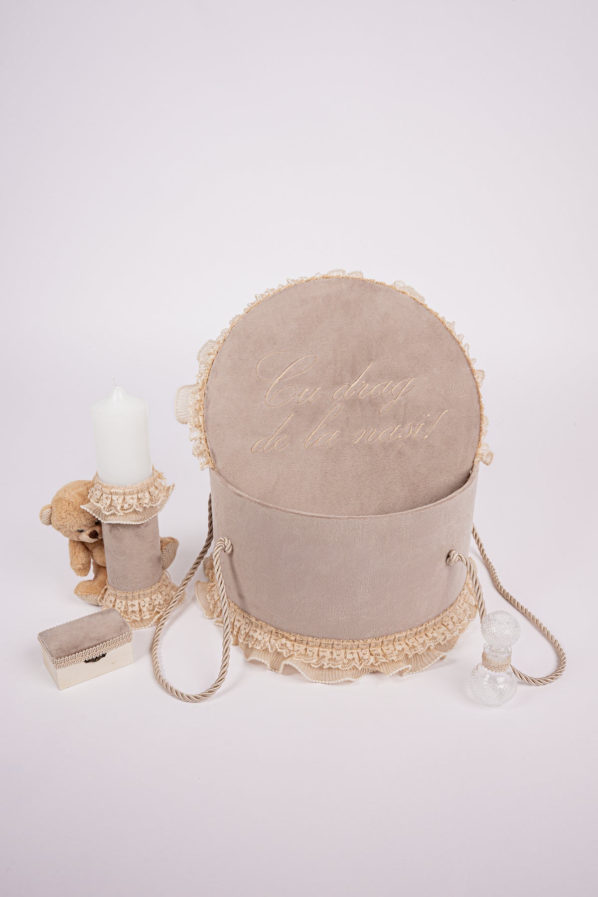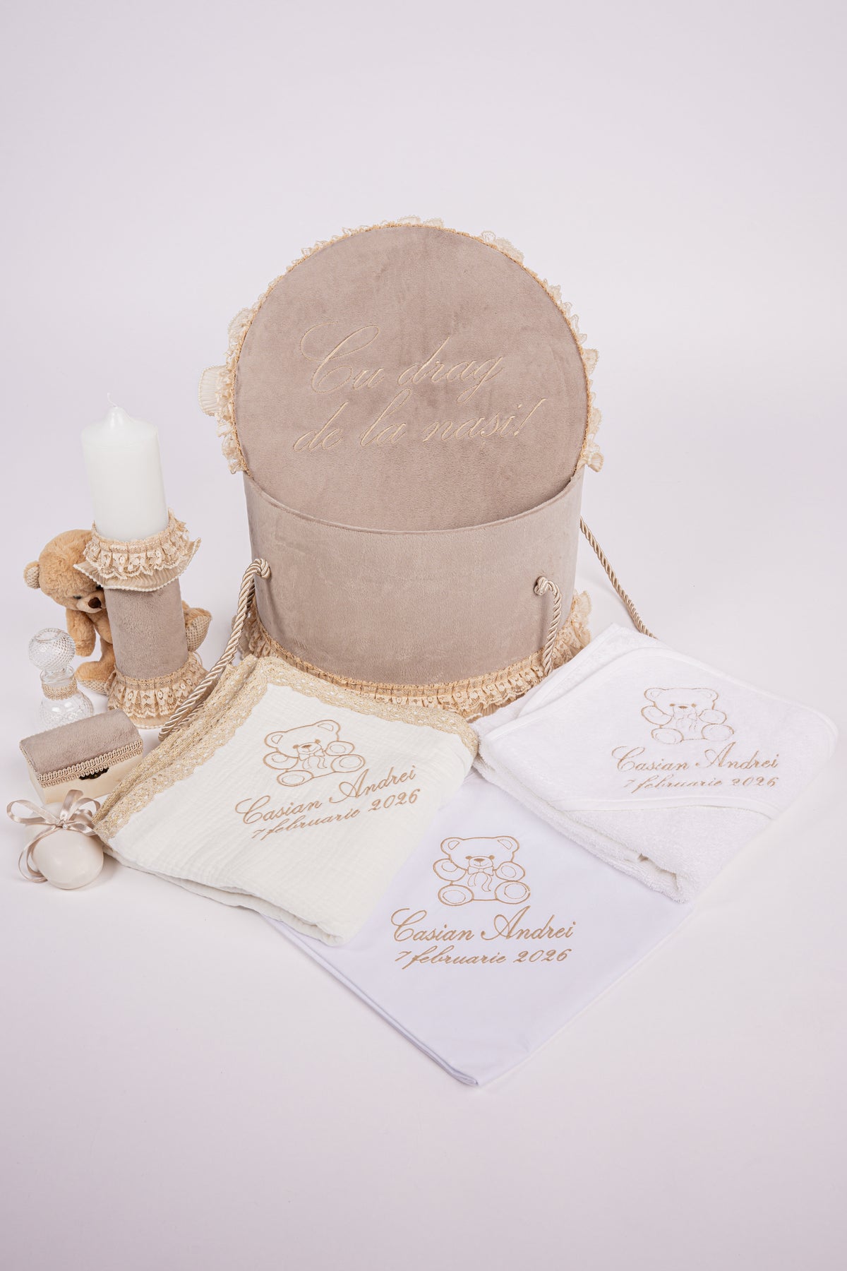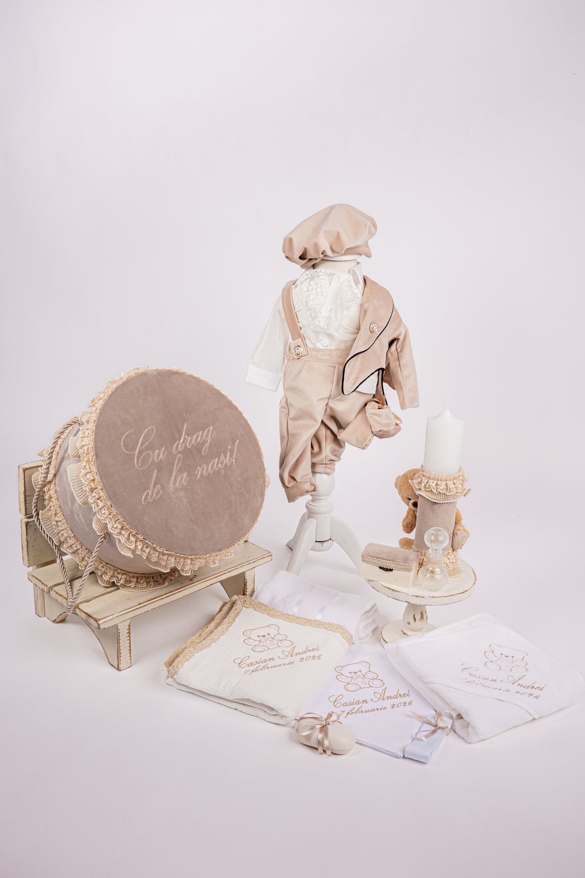 Descopera rafinamentul trusoului de botez Royal creat cu grija in atelierul nostru dedicat, unde pasiunea pentru detalii se imbina cu mestesugul. Fiecare element al acestui set captivant este confectionat cu atentie, garantand o experienta de neuitat in ziua botezului.