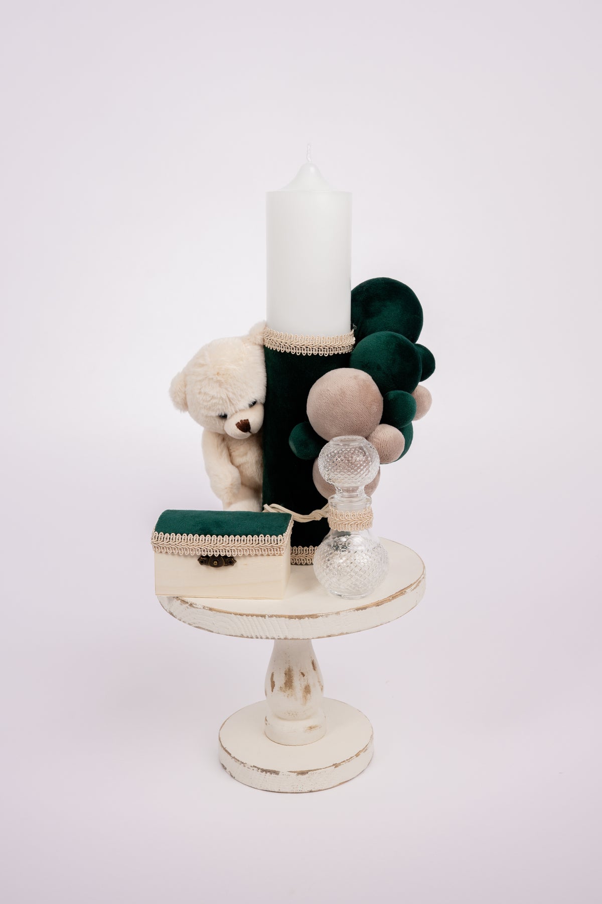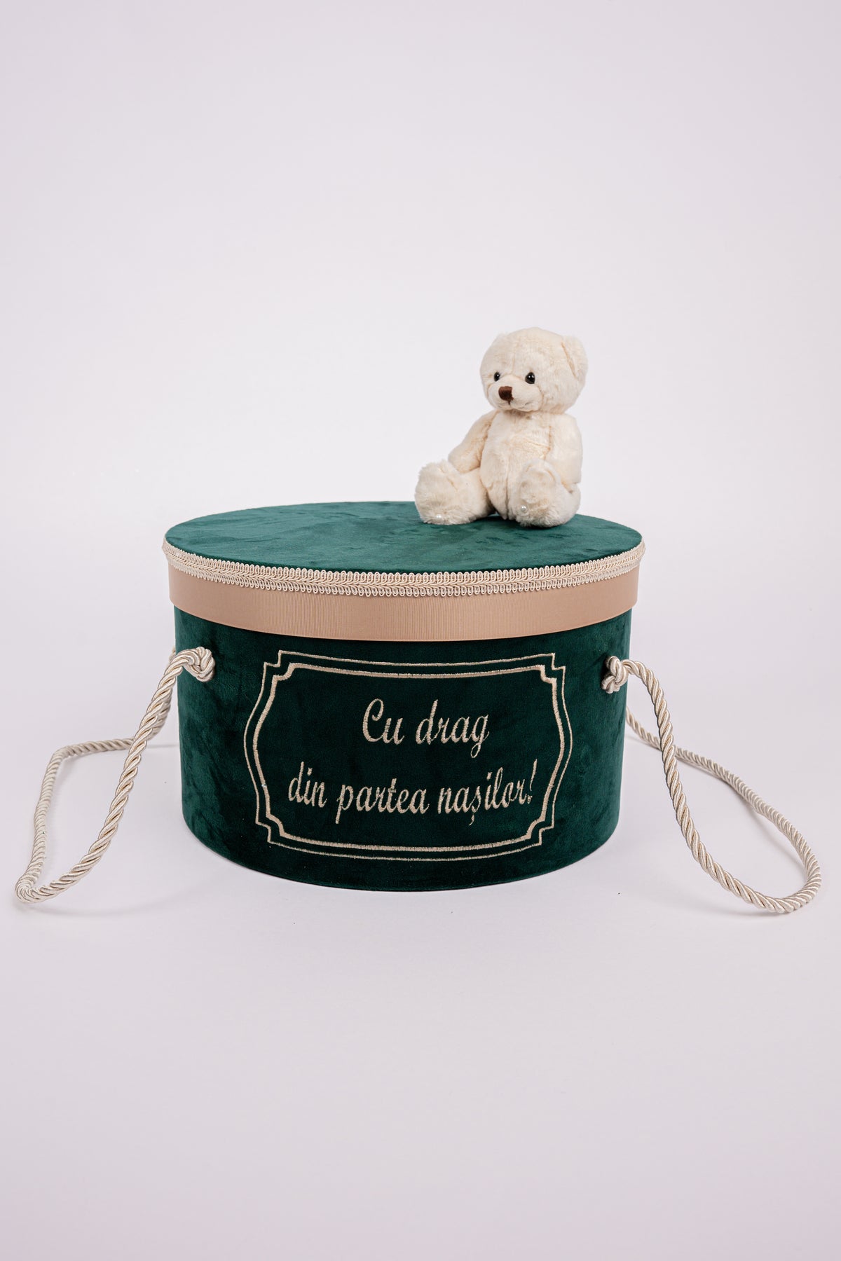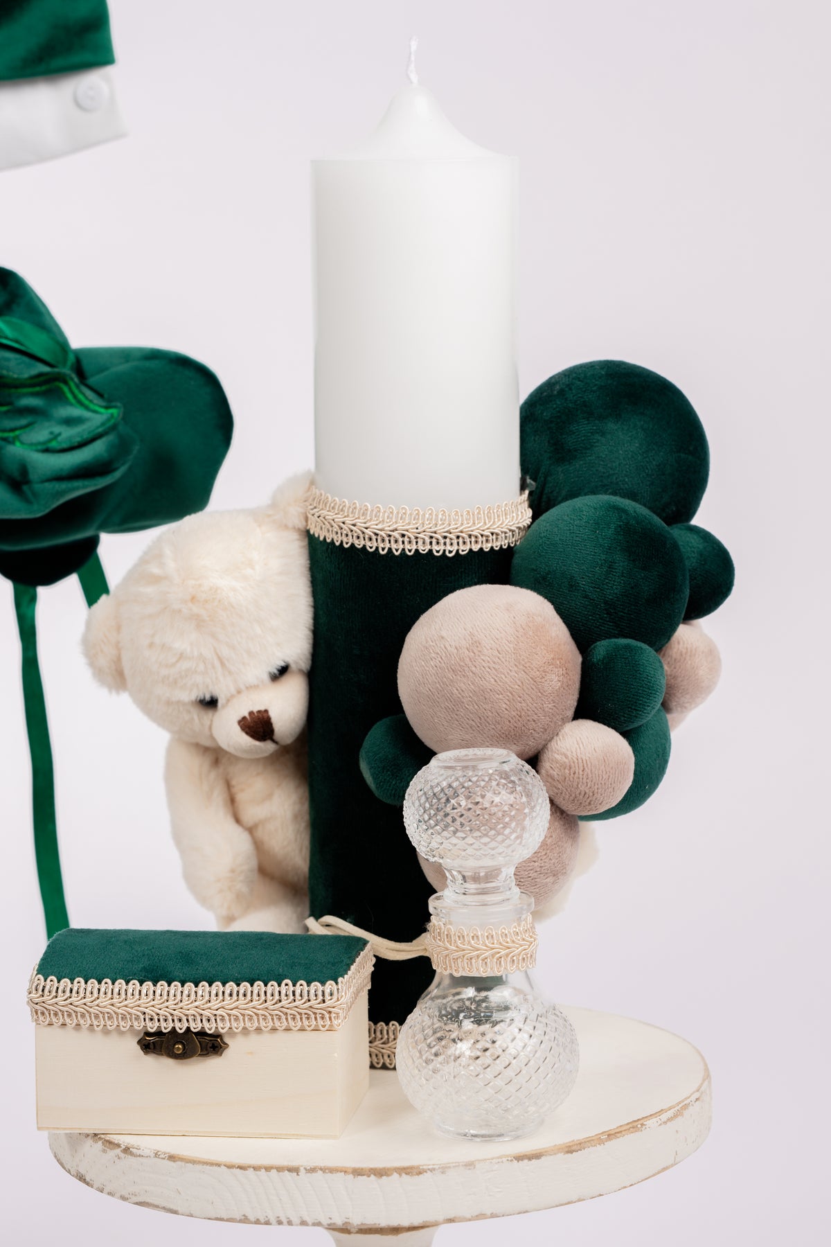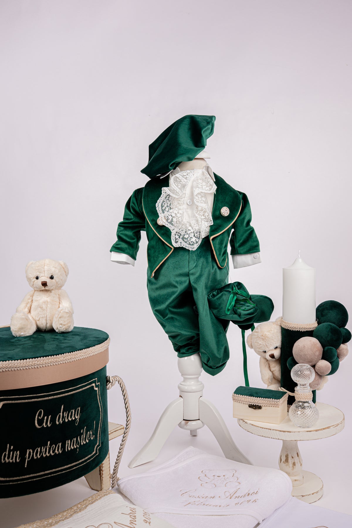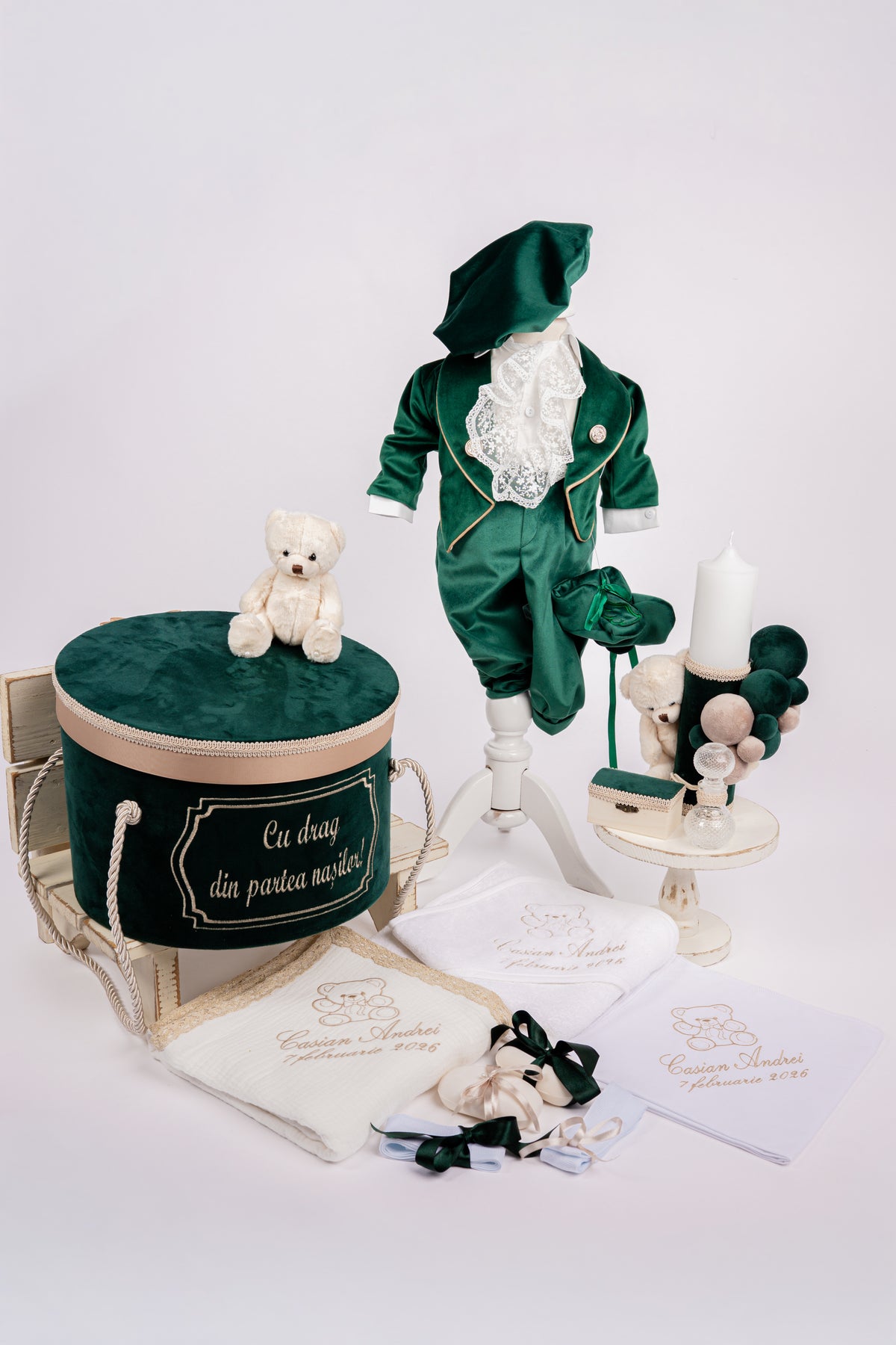 Descopera eleganta si rafinamentul trusoului „Ursulet Verde Smarald”, creat special pentru a face botezul bebelusului tau de neuitat. Acest set exclusiv combina designul sofisticat cu functionalitatea, oferind tot ce ai nevoie pentru un eveniment plin de magie.