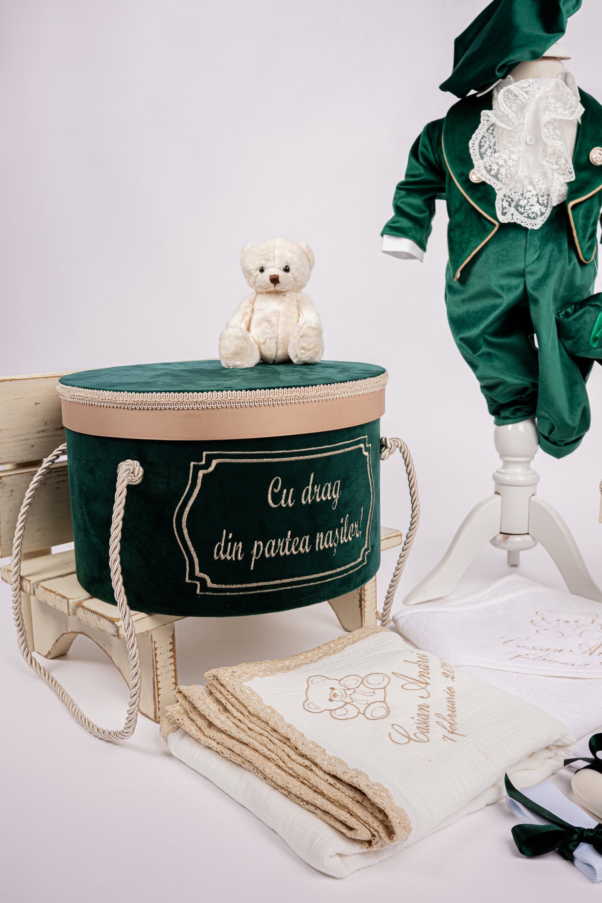 Fiecare element al trusoului „Ursulet Verde Smarald” a fost creat cu atentie la detalii, pentru a asigura confortul si bucuria bebelusului si parintilor. Comanda acum acest trusou deosebit si transforma botezul intr-un moment cu adevarat special!