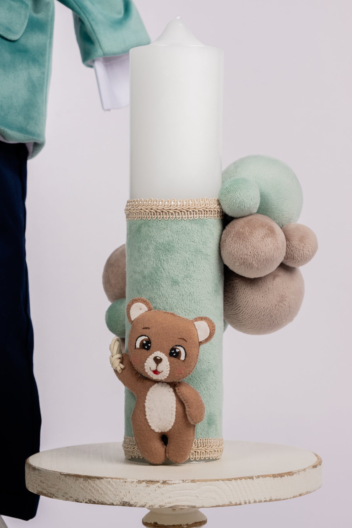 -*Lumanare*  decorata cu ursulet din fetru, baloane din catifea si personalizata cu numele copilului, se achizitioneaza separat!